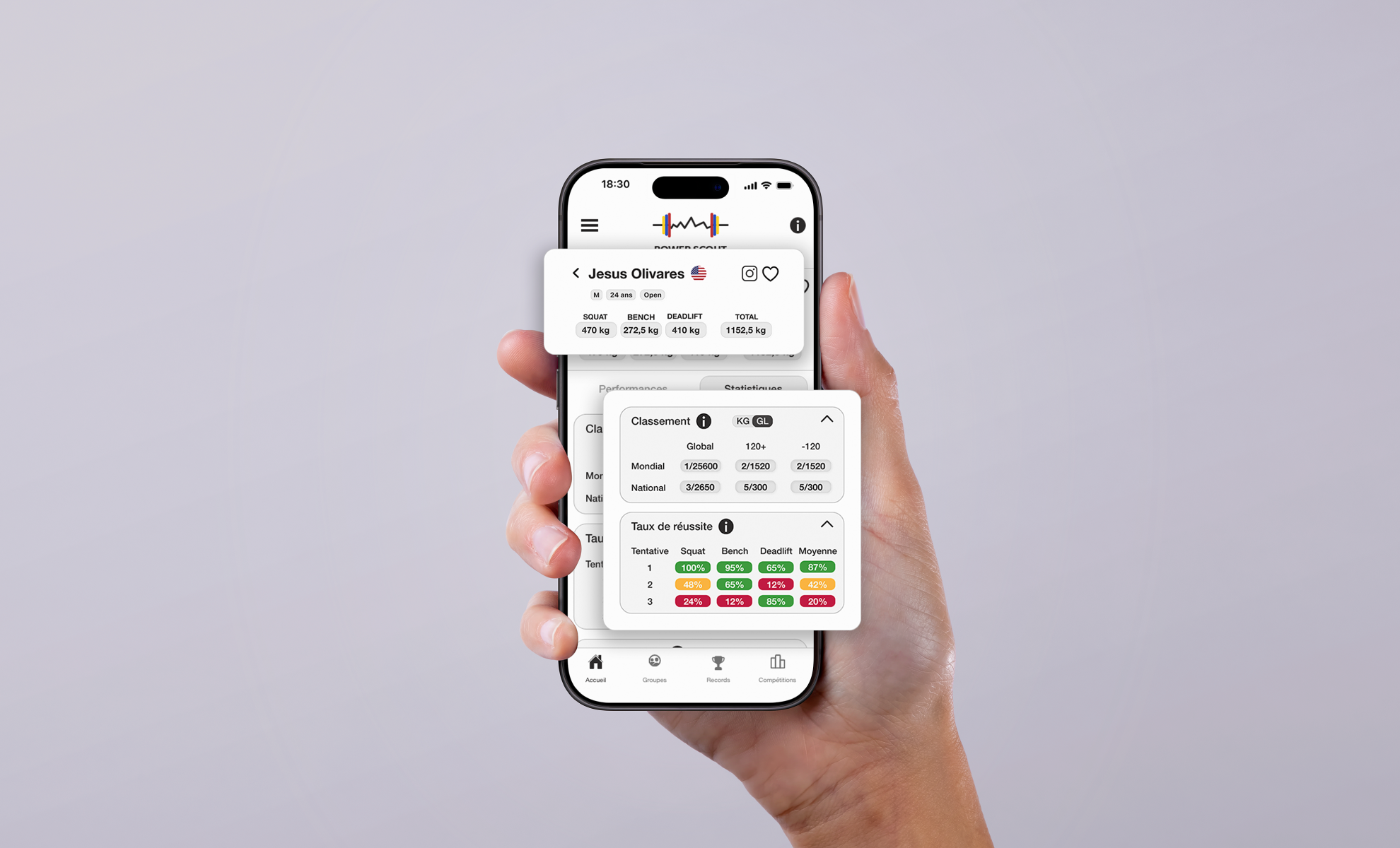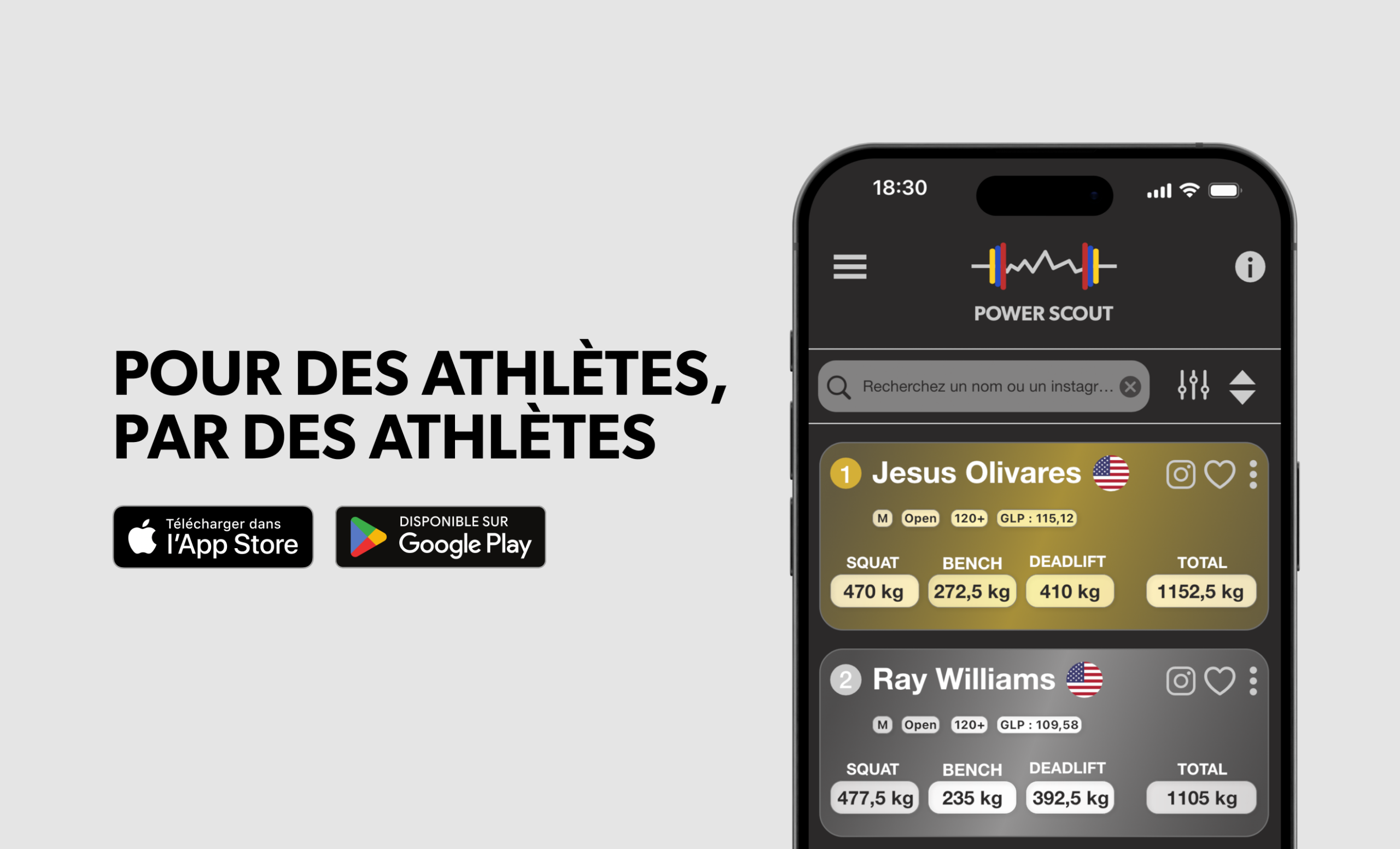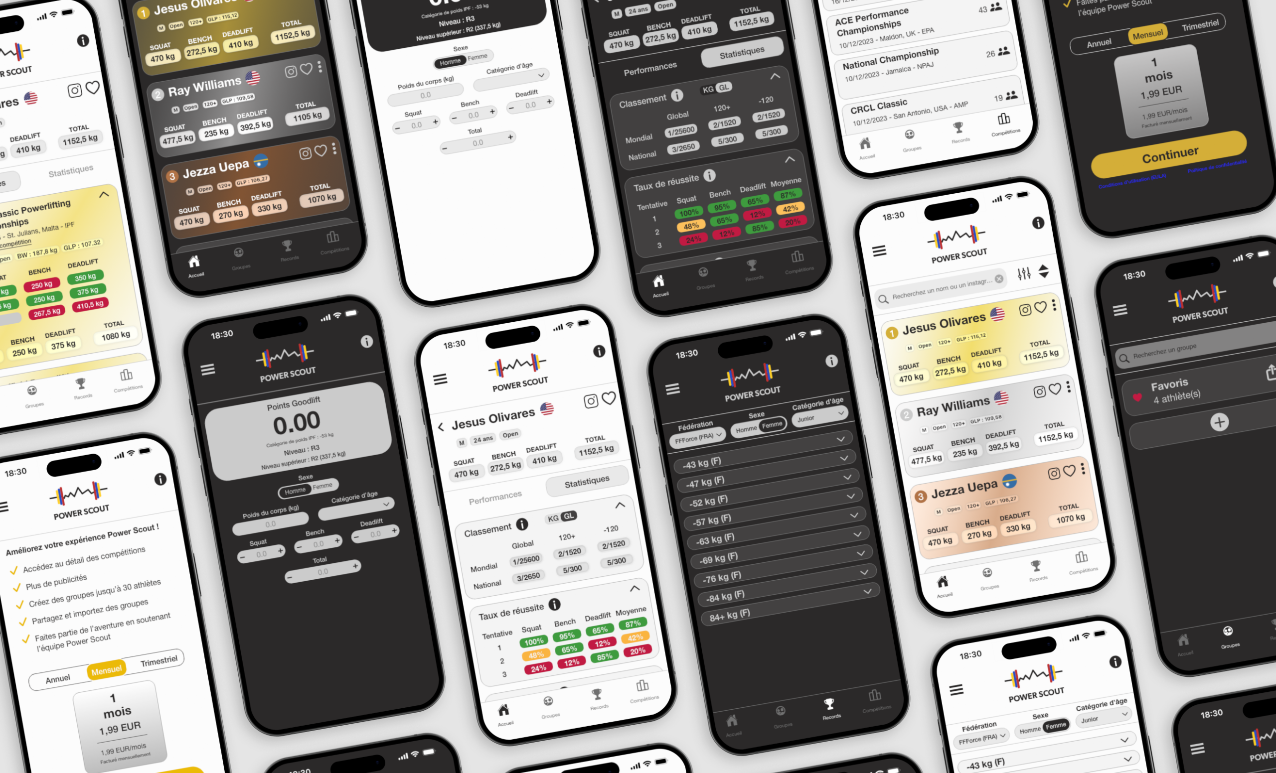 Power Scout est une application mobile destinée aux athlètes, coaches et fédérations de force athlétique (powerlifting) permettant de simplifier la gestion et l’analyse de données d’athlètes concourant aux 4 coins du monde.