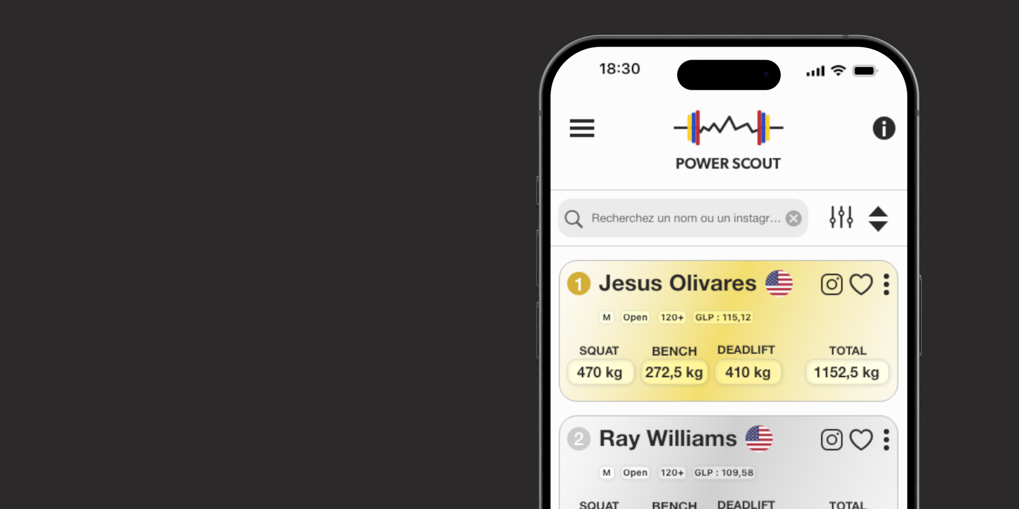 Power Scout est une application mobile destinée aux athlètes, coaches et fédérations de force athlétique (powerlifting) permettant de simplifier la gestion et l’analyse de données d’athlètes concourant aux 4 coins du monde.